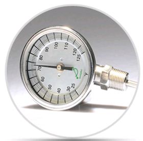 雙金屬溫度計,可以在各種生產(chǎn)過程中直接測量-50+ 500范圍內(nèi)的液體、蒸氣和氣體介質(zhì)的溫度。其工作原理是將帶螺紋的熱雙金屬用作溫度傳感裝置,并將其安裝在保護(hù)套中,保護(hù)套的一端是固定的,稱為固定端,另一端連接到細(xì)軸(稱為自由端)上。線軸自由端有一個指針。當(dāng)溫度變化時,溫度傳感裝置的自由端隨之旋轉(zhuǎn),驅(qū)動細(xì)軸上的指針產(chǎn)生角度變化,并且相應(yīng)的溫度顯示在刻度盤上。它可以與各種安裝殼體結(jié)合使用,以滿足不同溫度水平的要求。