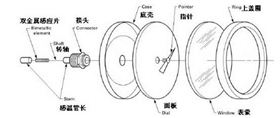 雙金屬溫度計(jì)的工作原理是基于固體受熱膨脹的原理,把兩片膨脹系數(shù)差異很大的金屬片焊在一起。當(dāng)溫度變化時(shí),差異很大的膨脹系數(shù)造成了不同的膨脹和收縮,致使金屬片產(chǎn)生彎曲變形。根據(jù)不同的變形而產(chǎn)生不同的轉(zhuǎn)動(dòng)量,轉(zhuǎn)動(dòng)量帶動(dòng)連接的轉(zhuǎn)軸和另一端的指示針,指示出了溫度。