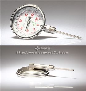 雙金屬溫度計是一種測量中低溫度的現場檢測儀表。雙金屬溫度計可以直接測量各種生產過程中的-80℃~+500℃范圍內液體、蒸汽和氣體介質溫度。雙金屬溫度計原理是將繞成螺紋旋形的熱雙金屬片作為感溫器件,并把它裝在保護套管內,其中一端固定,稱為固定端,另一端連接在一根細軸上,稱為自由端。在自由端線軸上裝有指針。當溫度發生變化時,感溫器件的自由端隨之發生轉動,帶動細軸上的指針產生角度變化,在標度盤上指示對應的溫度。